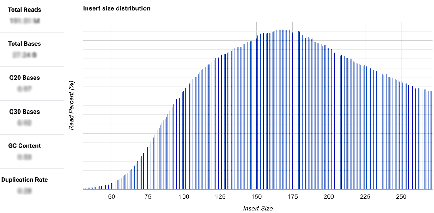 If FASTQ and BAM files are uploaded, you can also find various quality parameters in the graphic, as shown on the left side. In this area, you can access information such as Phred scores like Q20 and Q30, the total bases and the total reads, GC content, and duplication rate.