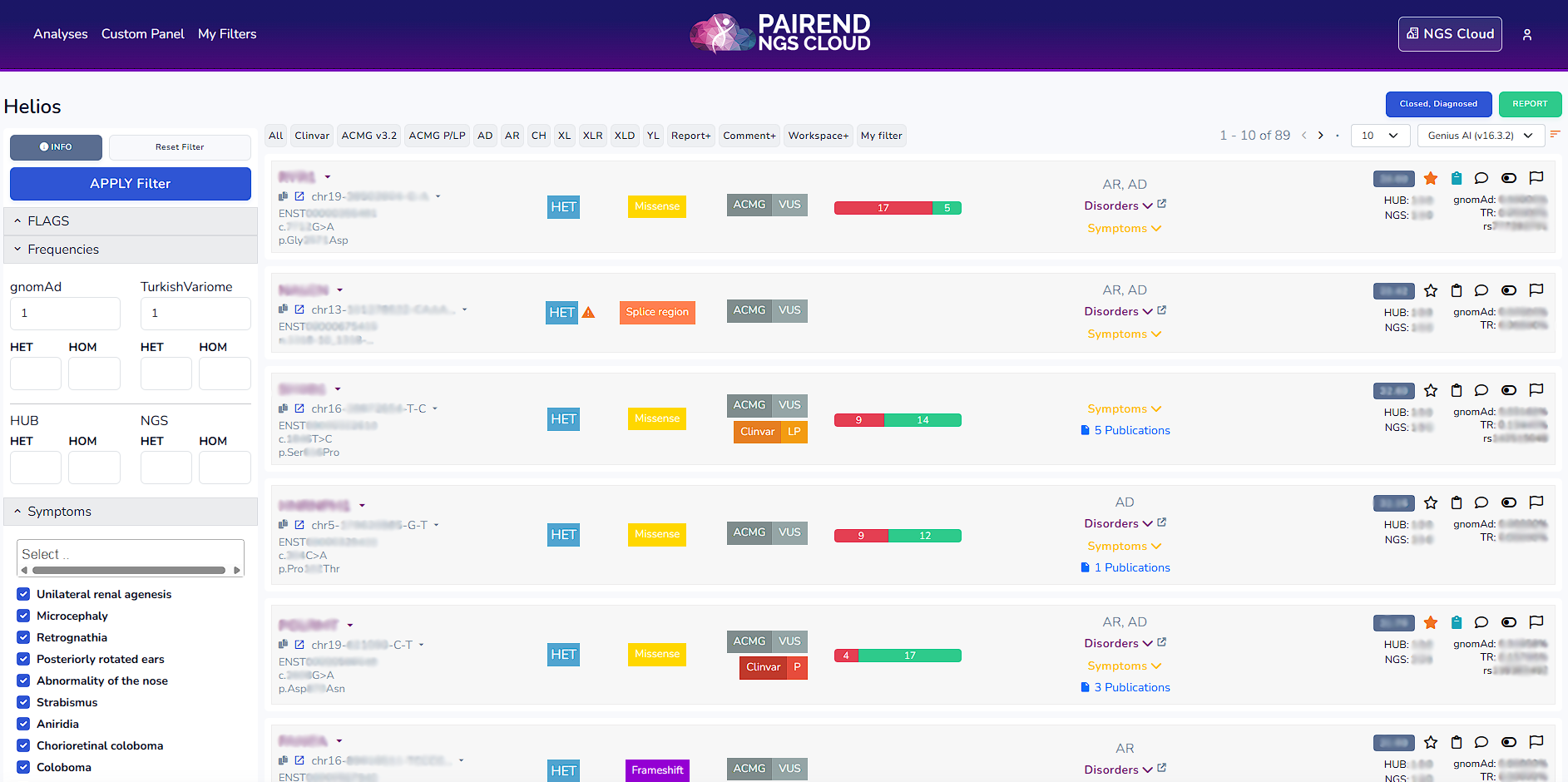 Variant card also includes the transcript number (ENST00000409619), the nucleotide change (c.2338C>T), the amino acidic change (p.Arg780Cys), the zygosity (HET,HOM), the type of the mutation (Ex: Missense), ACMG and Clinvar evaluations, Insilico pathogenicity scoring (Ex: 15 damaging, 7 tolerated), links to publications through Mastermind, frequencies within the HUB (number of het, hom within the facility that does the analysis), frequencies within NGS Cloud (number of het, hom within our in house data pool), gnomAD frequency (Ex:0.00000%), Turkish variome frequency (Ex:TR:0.25873%) and the rs number (Ex:rs782165016)