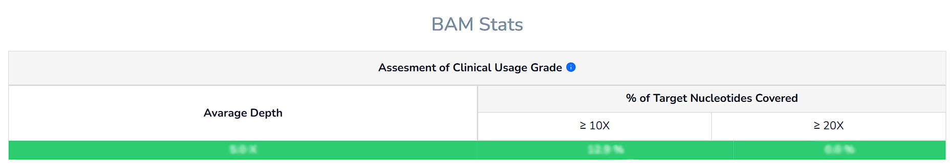 We indicate whether the parameters of your exome/genome sequence analysis reach a clinical usage grade using colour codes (GREEN/PASS or RED/FAIL) with the criteria described in the literature.