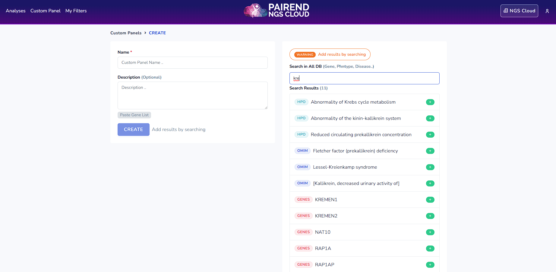 For the analysis it is possible to create an in silico custom panel. Click Custom Panel and enter genes, phenotypes or diseases that are related to the case. Click enter to search for the options. Select them by clicking + button. Write a custom panel name, write down the description (optional) and click CREATE button.