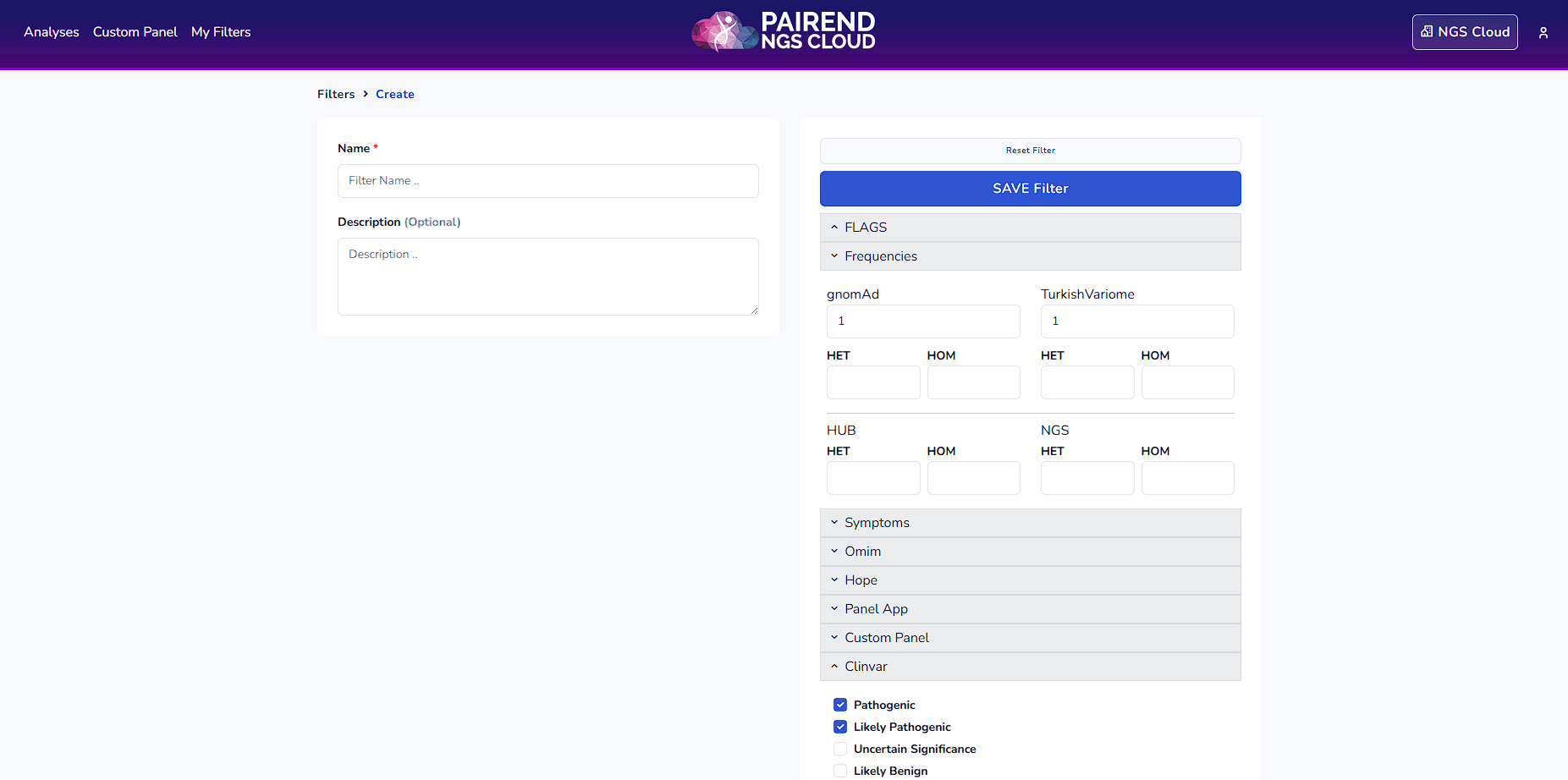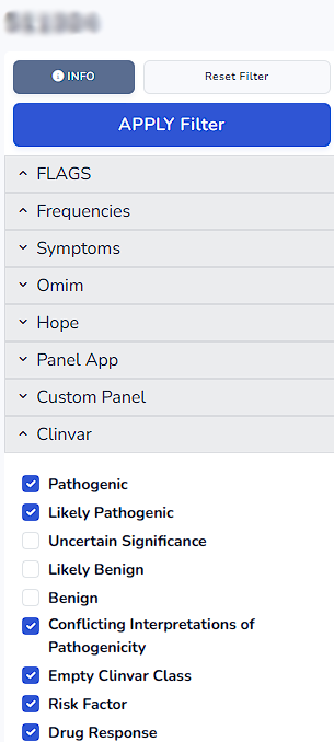 Once you click the filters on the left side the definition of the filter can be accessed. For instance in Clinvar filter below mentioned variants are being filtered.