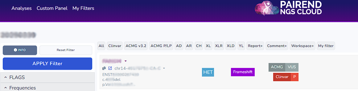 NGS Cloud offers default filters: All (shows all the variants), Clinvar, ACMG v3.2, ACMG P/LP, AD (Autosomal Dominant), AR (Autosomal Recessive), CH (Compound Heterozygote), XLR (X linked recessive), XLD (X linked dominant), YL (Y chromosome linked), Report (variants that are reported), Comment (variants that possess a comment), Workspace (variants that are kept within the workspace).