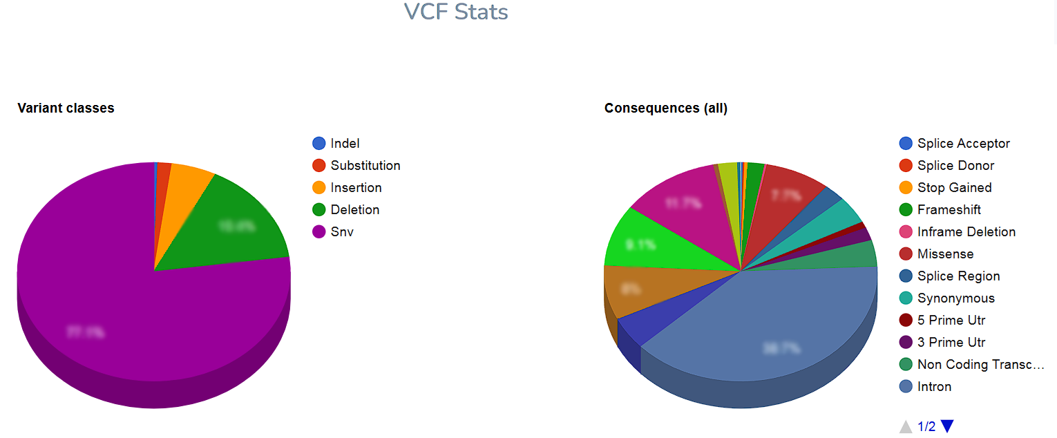 You can find the total number of variants detected in the sample and the distribution according to the primary classification (SNP, Indel) and effect classes.